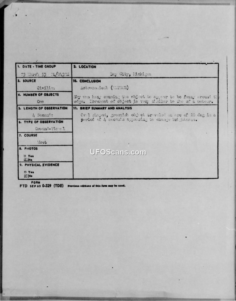 A lawyer in Bay City, Michigan, reported a four-second sighting of a greenish, elliptical object on March 23, 1953. The U.S. Air Force concluded the object was a meteor.
