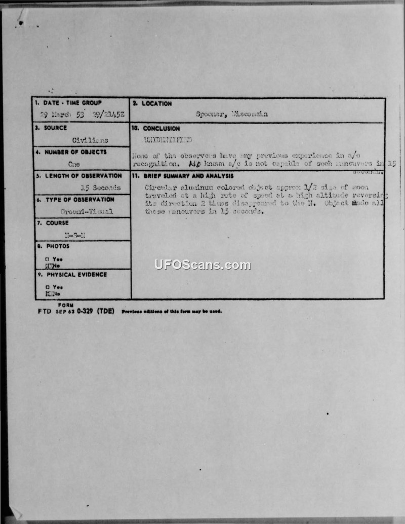 A civilian report of a circular, aluminum-colored disc seen in Spooner, Wisconsin, on 29 March 1953. The object performed rapid maneuvers over 15 seconds, leading to an 'UNIDENTIFIED' classification by the Air Force.