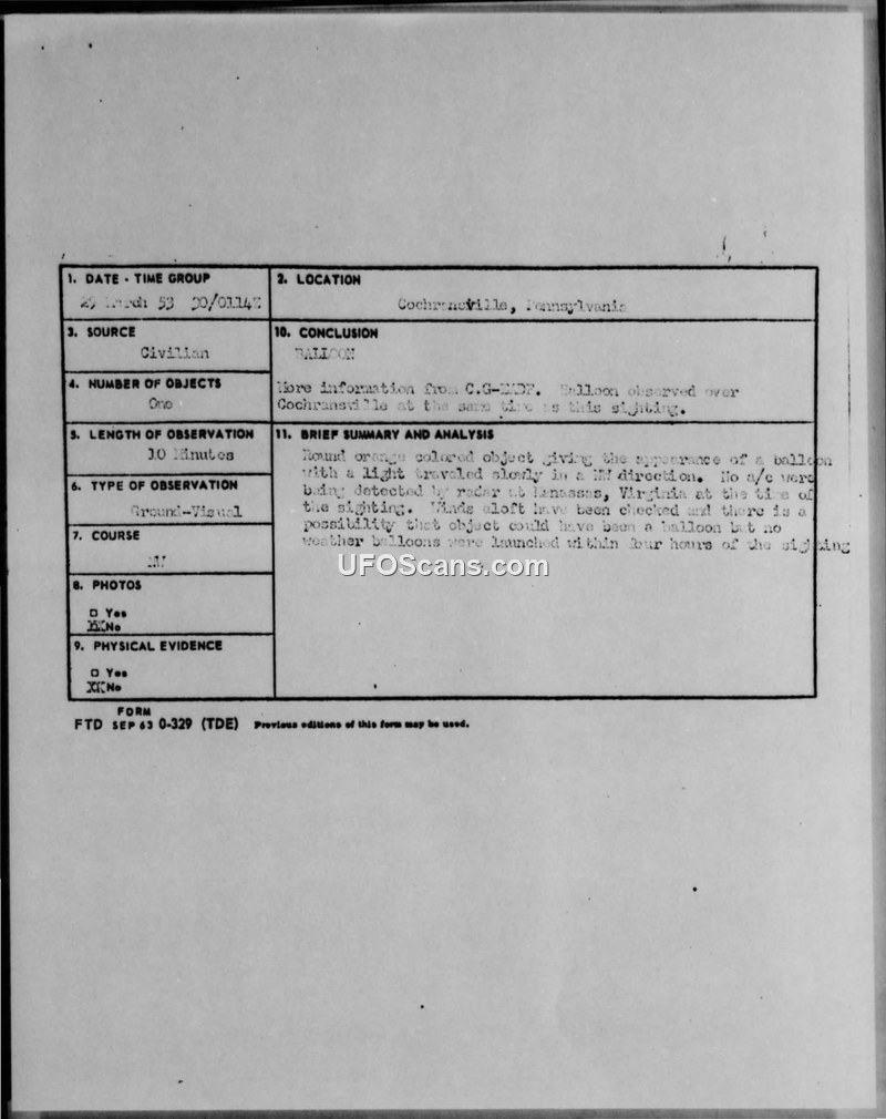 Unidentified Flying Object Report — Cochransville, Pennsylvania, March 30, 1953