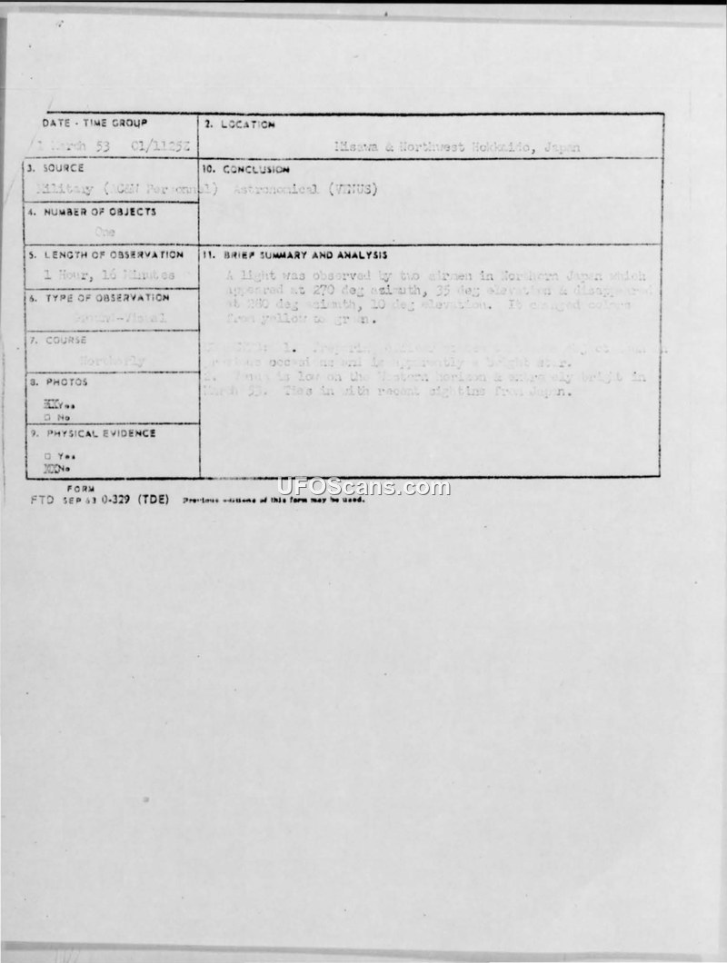 USAF personnel in Hokkaido, Japan, reported a starlike object on 1 March 1953 that changed colors and appeared to vibrate. Intelligence officers concluded the object was likely the planet Venus or a star, consistent with previous sightings in the region.