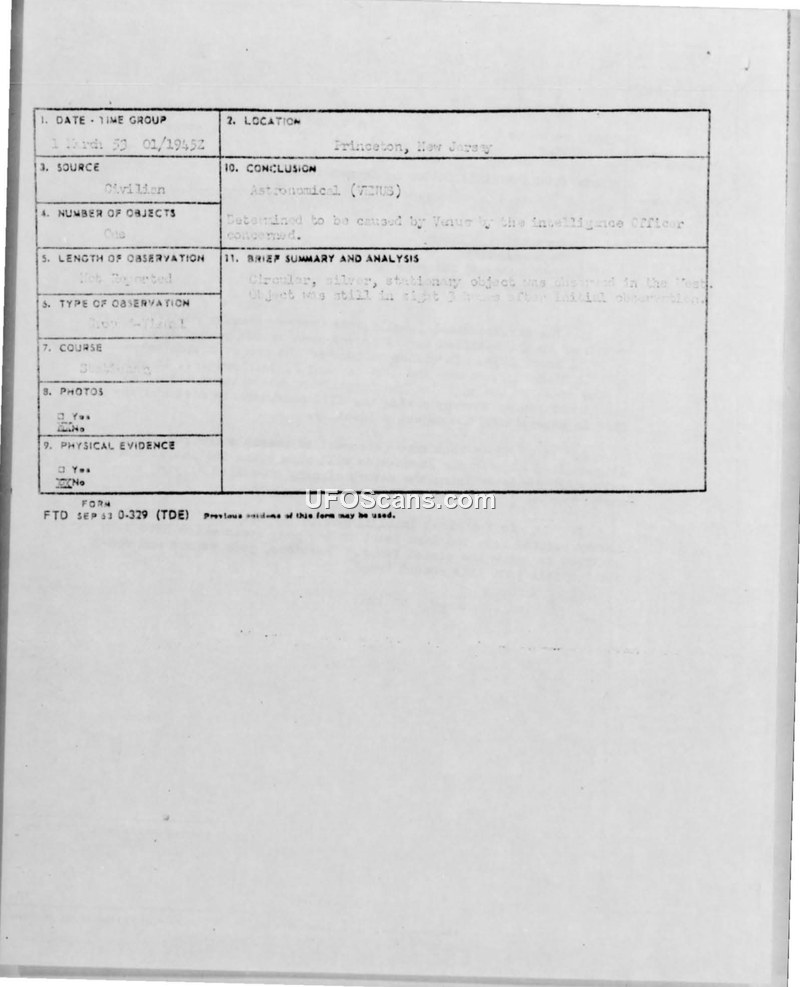 A civilian report of an unidentified object over Princeton, NJ, was investigated by Air Force personnel and identified as the planet Venus. The report highlights the Air Technical Intelligence Center's efforts to address a trend of similar sightings.