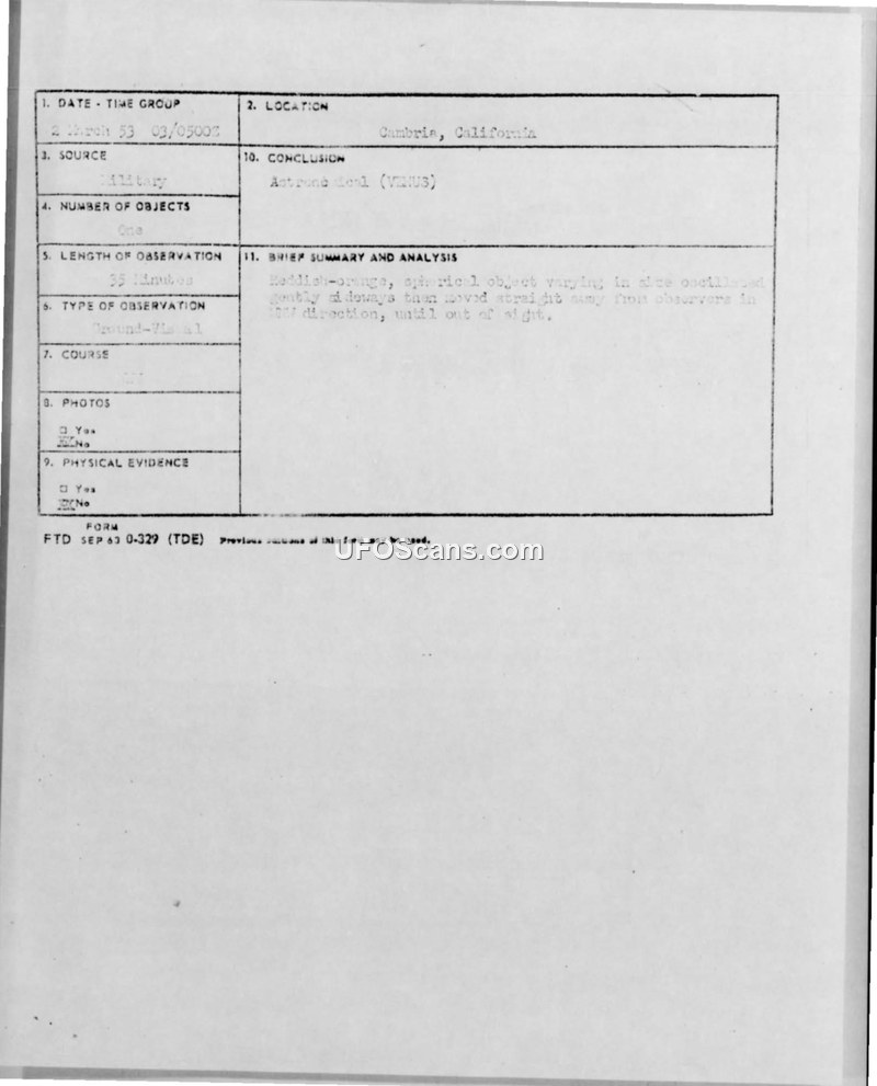Four airmen at the 775th AC&W Squadron in Cambria, California, reported a spherical, reddish-orange object on 2 March 1953. Intelligence officials concluded the object was likely a bright planet viewed through atmospheric haze and smoke.