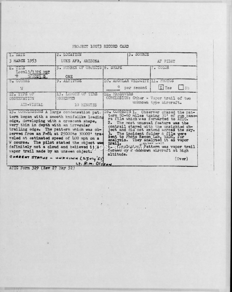 Project 10073 Record Card — Luke AFB, Arizona, 3 March 1953