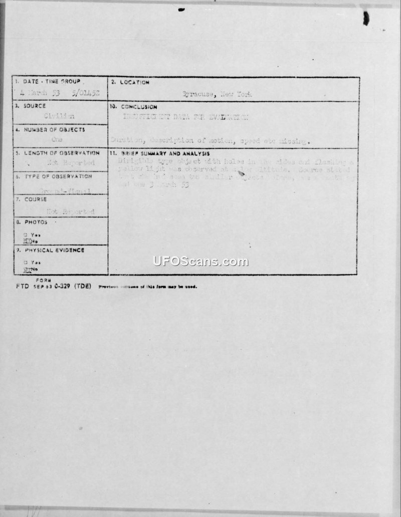 A civilian witness reported a dirigible-shaped object with flashing lights near Syracuse, NY, on March 4, 1953. The military investigation found no radar evidence and concluded there was insufficient data to evaluate the report.
