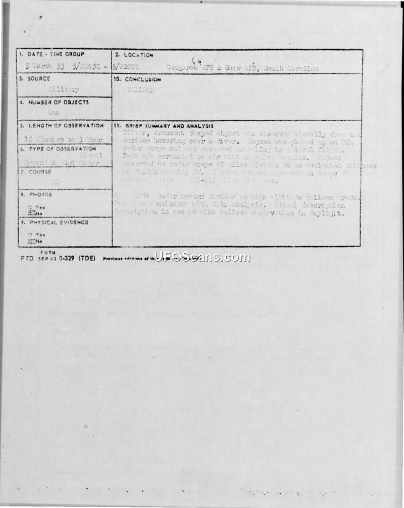 Unidentified Aerial Object Sighting — Congaree AFB & Shaw AFB, South Carolina, 5 March 1953