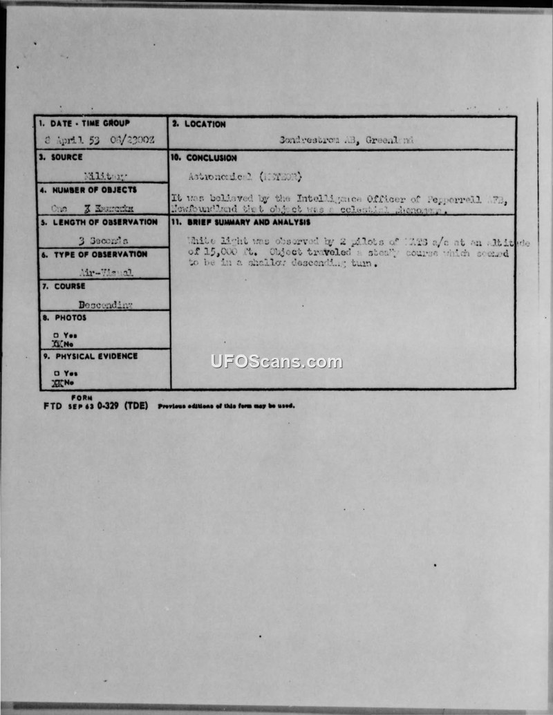 On 8 April 1953, two pilots observed a fast-moving white light over Greenland. Military intelligence and Project Blue Book investigators concluded the object was a meteor.