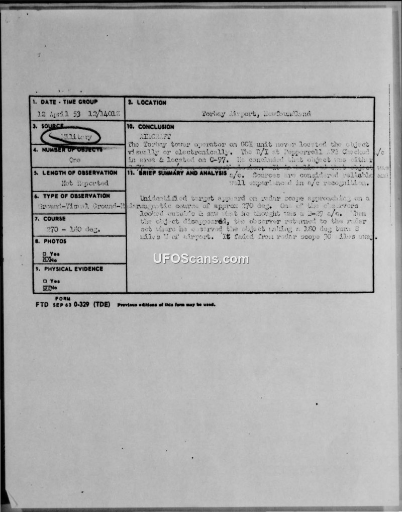 Air Intelligence Information Report: Unidentified Aircraft, Torbay Airport, Newfoundland, 12 April 1953