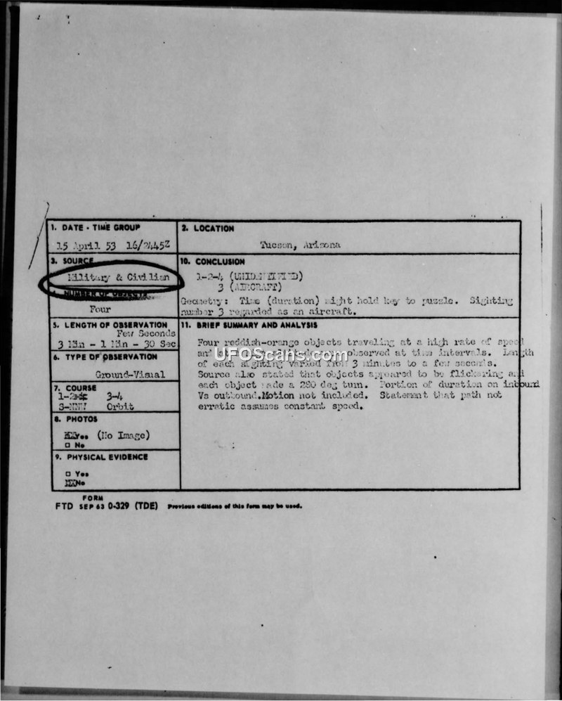 Incident Report: Sighting of Unidentified Aerial Objects, Tucson, Arizona, 15 April 1953