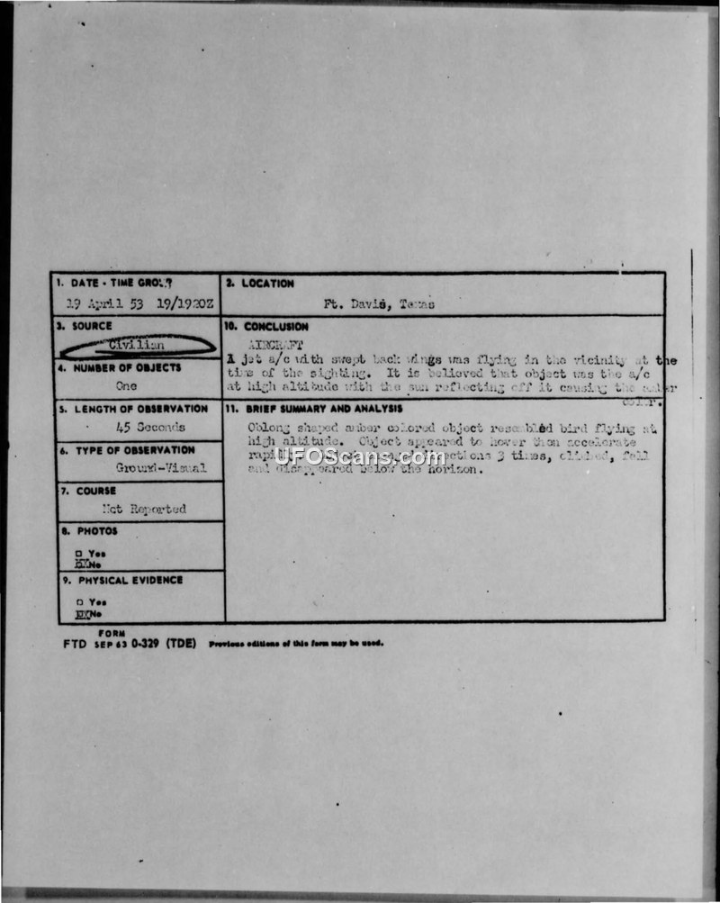 Incident Report — Ft. Davis, Texas, 19 April 1953