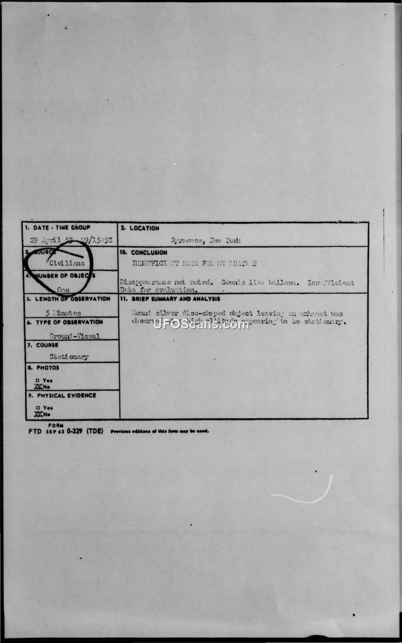 Unidentified Flying Object Sighting Report — Syracuse, New York, 29 April 1953