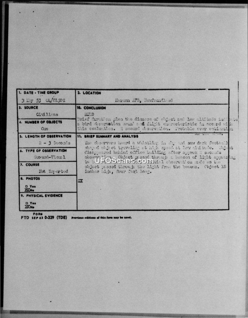This Air Intelligence Information Report (IR-24-53) details a sighting of an unidentified flying object on May 4, 1953, at Harmon AFB, Newfoundland. The report, authored by Captain Nathan J. Neynson, documents an incident involving two Canadian nationals—a male civilian and his female fiancee—who observed an object while seated on the steps of the Canadian Post Office building at the base. The witnesses reported seeing a dark, football-shaped object, approximately four to five feet long and 18 inches thick, traveling at high speed and low altitude. The object was described as having a light metallic or tin-like color and produced a whistling sound, which the witnesses compared to pieces of tin striking each other. The observation lasted approximately two to three seconds. The object was seen passing through a beam of light from a rotating beacon and remained visible briefly after the light beam had passed before disappearing behind an office building. The report includes a sketch of the object's shape and its trajectory relative to the observers and the post office building. Official analysis by the Air Technical Intelligence Center (ATIC) concluded that the object was likely a bird, citing the brief duration, dimness, and low altitude as consistent with such an observation, and suggesting that the witnesses' estimates of size and speed were likely overestimations. The report notes that no weather balloons were released at the time, and a check of aircraft flight plans yielded negative results, making it unlikely that an aircraft accounted for the sighting. Despite the official conclusion of a bird, the report acknowledges that the estimated speed was comparable to that of a small aircraft, though the lack of flight plans led to the final evaluation.