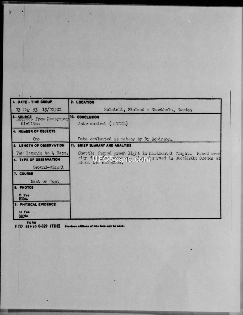 A shuttle-shaped greenish light was observed over Helsinki and Stockholm on 13 May 1953. ATIC investigator Dr. Robinson concluded the phenomenon was likely a meteor.