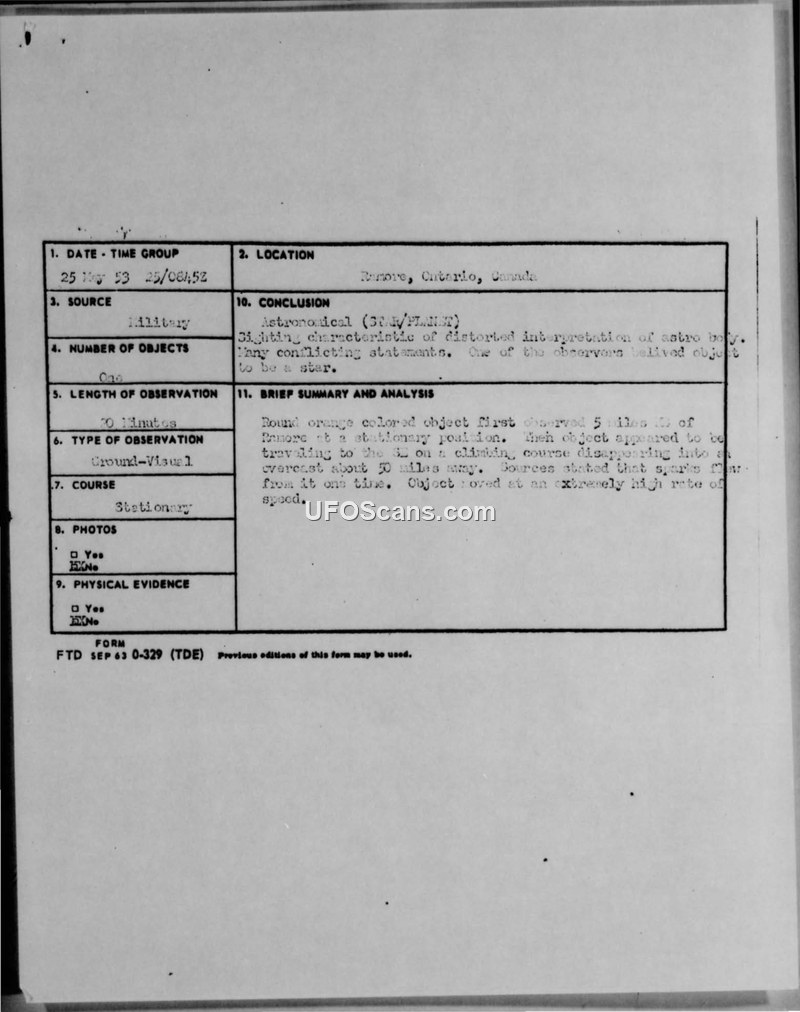 Incident Report: Sighting of Unidentified Aerial Object, Ramore, Ontario, 25 May 1953