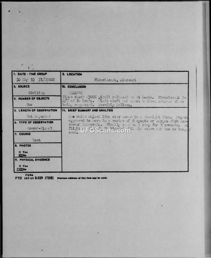 Unidentified Flying Object Observed Florissant, Missouri, 30 May 53