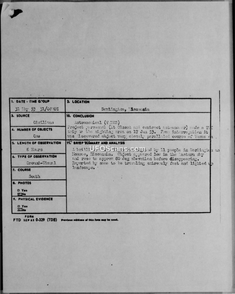 Incident Report: Darlington-Monroe, Wisconsin Sighting, 31 May 1953
