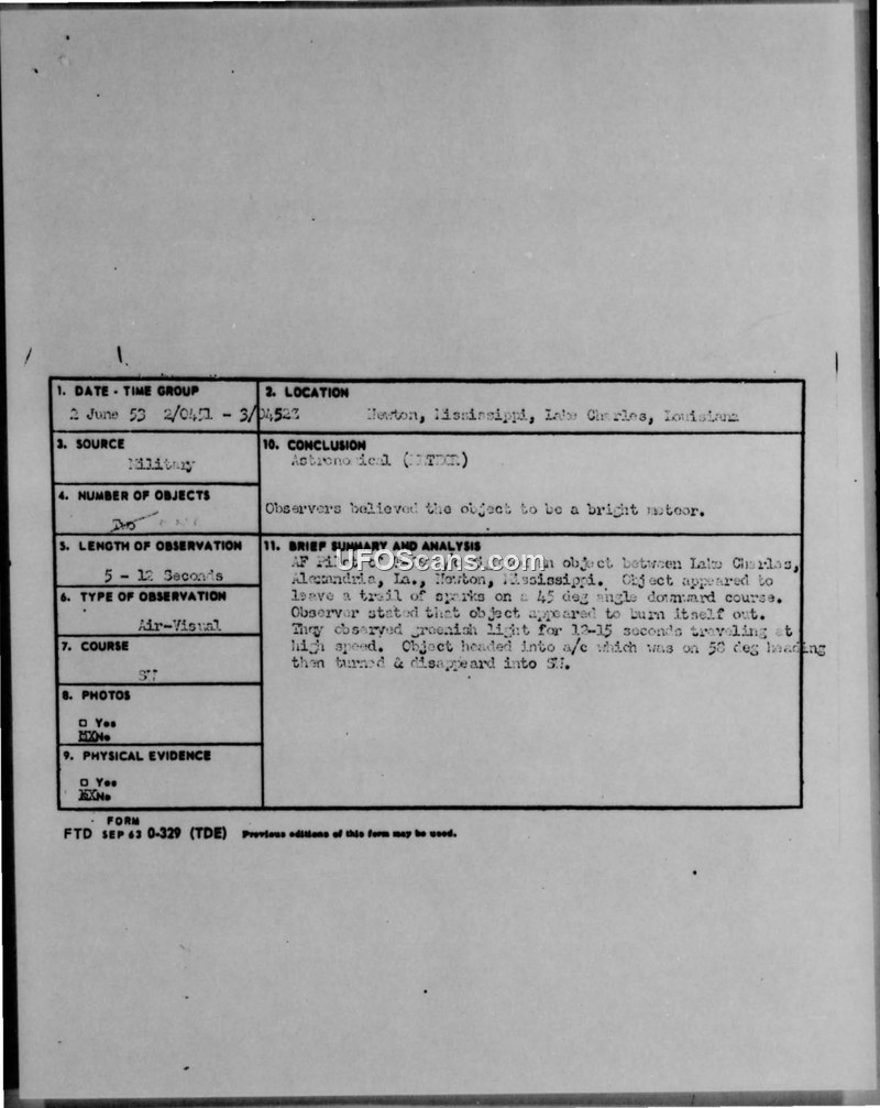 On June 2, 1953, USAF pilots reported a bright, fire-trailing object near Newton, Mississippi, which was officially identified as a meteor. Simultaneously, an observer in San Antonio, Texas, reported multiple yellowish lights maneuvering over the city for two hours.