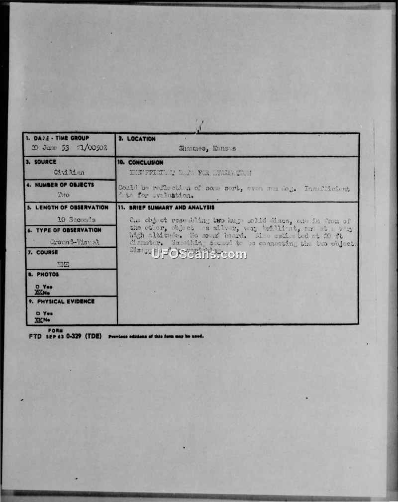 A housewife in Shawnee, Kansas, reported seeing two connected, brilliant silver disc-like objects on June 20, 1953. The Air Force investigation concluded there was insufficient data to identify the objects, suggesting they might have been a reflection or sun dog.
