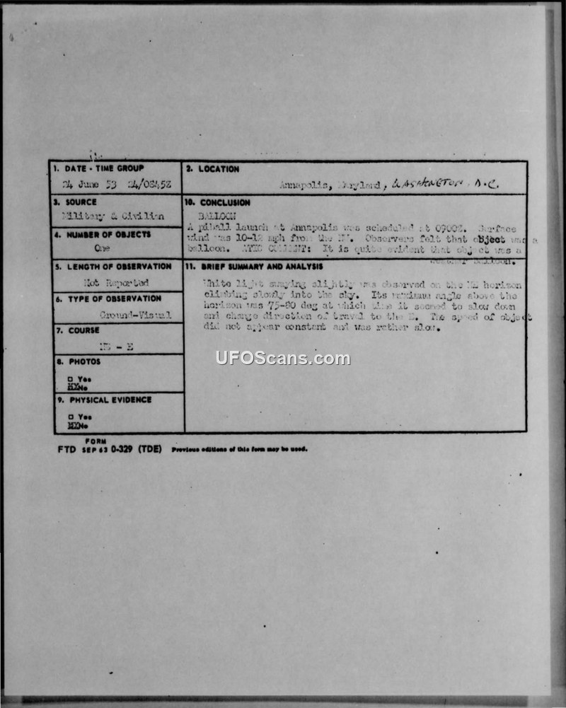 Sighting Incident Report — Annapolis, Maryland, 24 June 1953