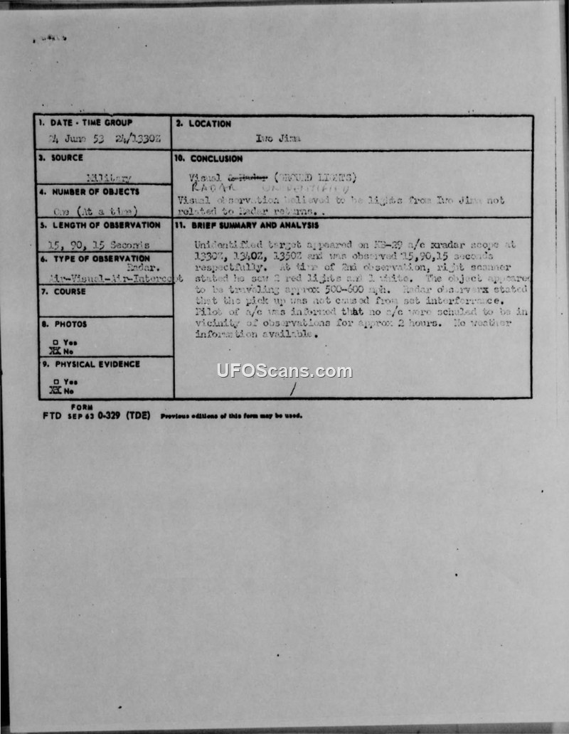 A KB-29 aircraft reported multiple radar contacts with an unidentified object near Iwo Jima on 24 June 1953. Intelligence analysis concluded the radar returns were likely interference or anomalous propagation, while visual sightings were attributed to lights on the island.