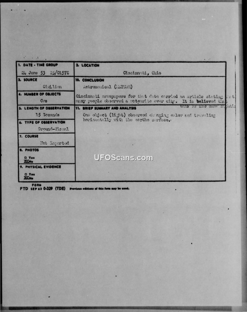 A witness in Cincinnati reported a spherical, color-pulsing object on 24 June 1953 that moved horizontally and turned 90 degrees. The Air Force officially classified the event as a meteor, despite the witness's detailed testimony describing non-meteoritic behavior.