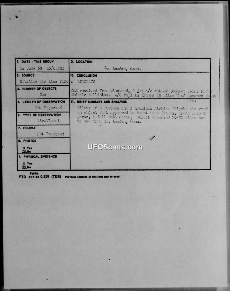 A reported UFO sighting near New London, Connecticut, was officially identified as the mid-air collision of two military jet aircraft from Quonset Point NAS. The investigation was conducted by Project Blue Book and concluded that the airline pilots had witnessed the crash.