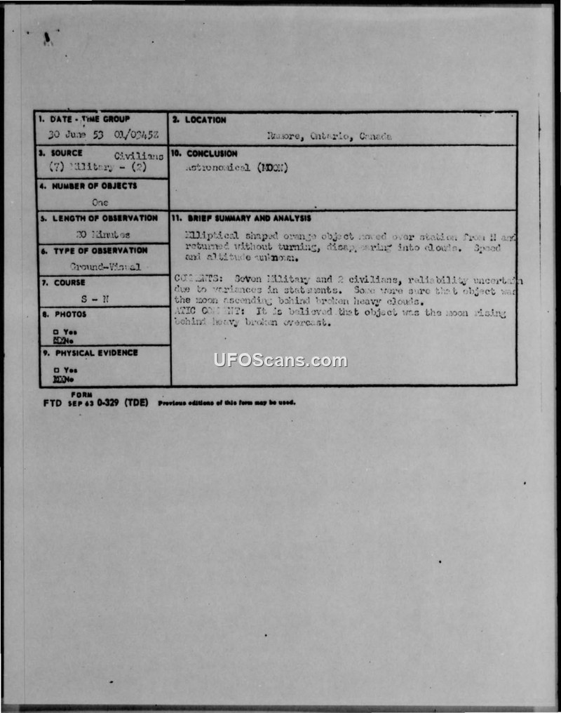 Air Intelligence Information Report: 912th AC&W Squadron Sighting, Ramore, Ontario, 30 June 1953