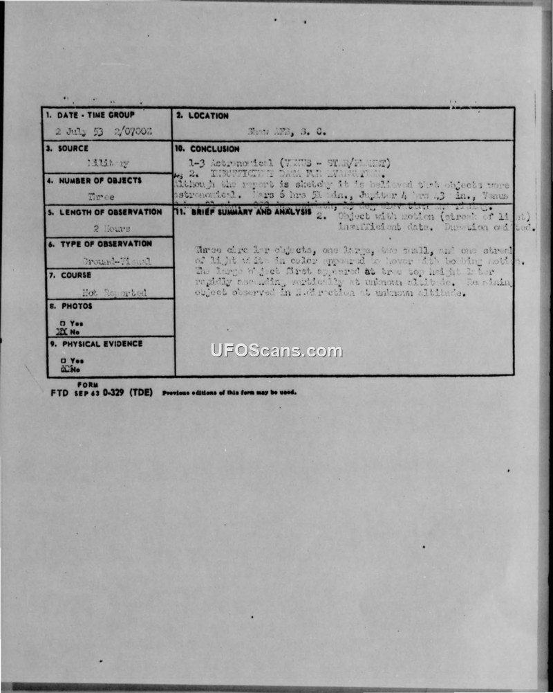 This report documents a 1953 sighting of three unidentified objects by two Air Force personnel at Shaw AFB. While the witnesses maintained the objects were not astronomical, the official intelligence conclusion classified them as astronomical bodies.