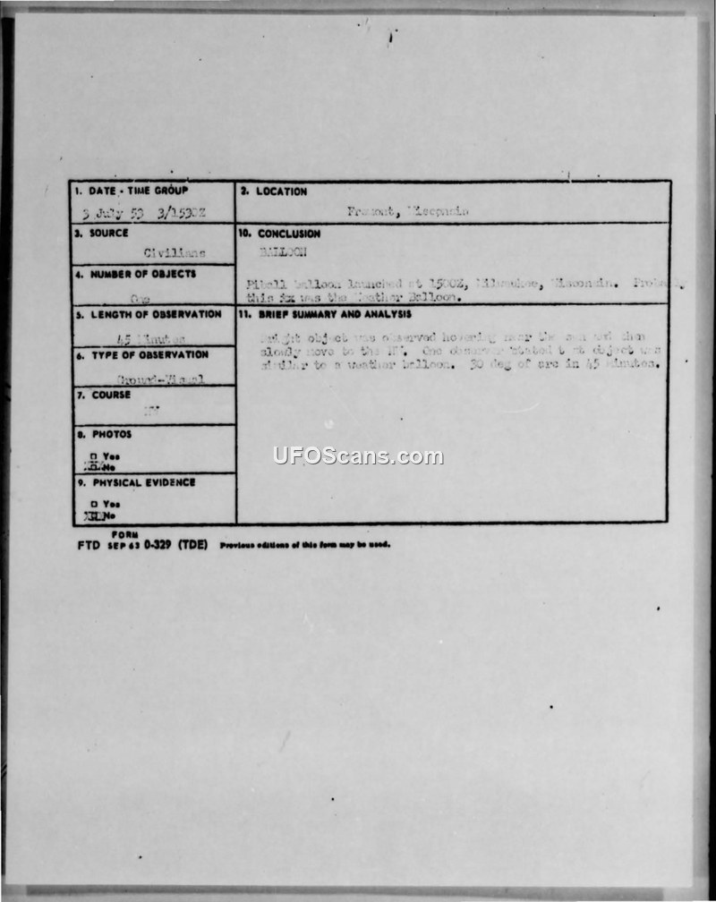 A witness reported two luminous, circular objects over Partridge Lake, Wisconsin, on July 3, 1953. The Air Force concluded the objects were a weather balloon launched from Milwaukee.