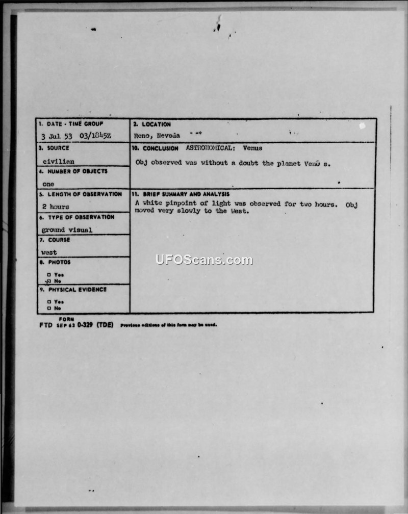 A civilian sighting of a stationary object in Reno, Nevada, on 3 July 1953 was reported to the Air Force. Despite the observers' efforts to secure verification, the incident was later officially concluded to be the planet Venus.