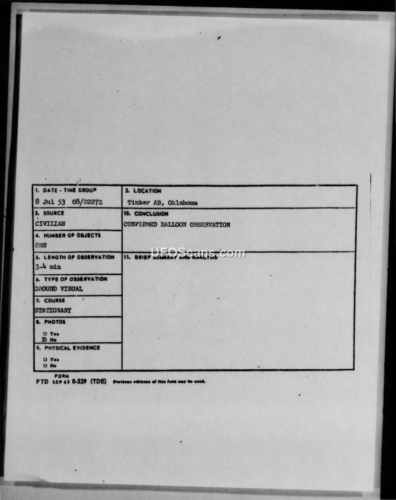 On 8 July 1953, personnel at Tinker AFB observed a stationary, white, round object for 3-4 minutes. ATIC concluded the object was a weather balloon.