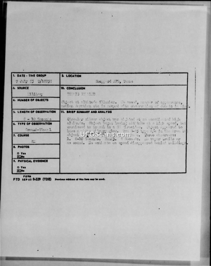 Three airmen at Sheppard AFB reported a metallic, disc-shaped object on 9 July 1953. The investigation concluded the sighting was likely an altitude illusion, despite the witnesses' consistent and detailed accounts.