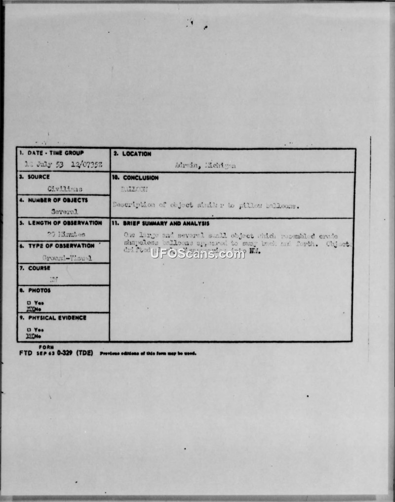 On 12 July 1953, at 3:35 P.M., a witness in Adrian, Michigan, observed a series of unidentified aerial objects while using field glasses to view a transport plane. The witness initially described seeing one large, shapeless, brownish object that appeared to sway back and forth like a pendulum, accompanied by approximately twenty smaller, silvery, mirror-like objects. The witness noted that the smaller objects appeared to be discs that darted around the larger object in a counter-clockwise direction, becoming visible only when reflecting sunlight. The objects were observed for approximately 20 minutes as they drifted slowly toward the North-West. The witness, a 43-year-old male with a background in production engineering, reported that the sky was clear with scattered clouds and a halo around the sun. He noted that the large object appeared to be a crude, shapeless balloon, possibly resembling a partially collapsed octahedron, while the smaller objects were highly polished metallic discs. The witness explicitly stated that there was no sound associated with the objects and that they did not appear to be radar foil. The official conclusion recorded on the report form is 'BALLOON', with the summary noting that the description of the objects was similar to 'pillow balloons'. The witness also speculated that the sighting might have been caused by an inversion or mirage, though he remained uncertain.