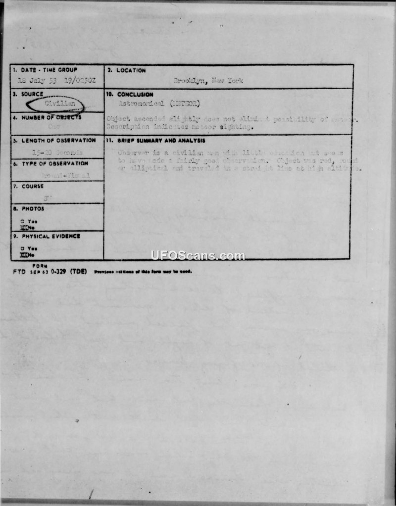 A civilian in Brooklyn reported a red, elliptical object on July 18, 1953. The U.S. Air Force officially concluded the sighting was a meteor.