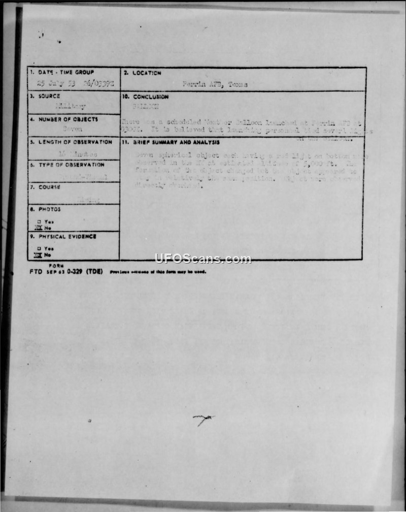 Air Force personnel at Perrin AFB reported seven red, spherical objects on 25 July 1953. While initially treated as a significant UAP sighting, the event was later officially concluded to be a weather balloon.