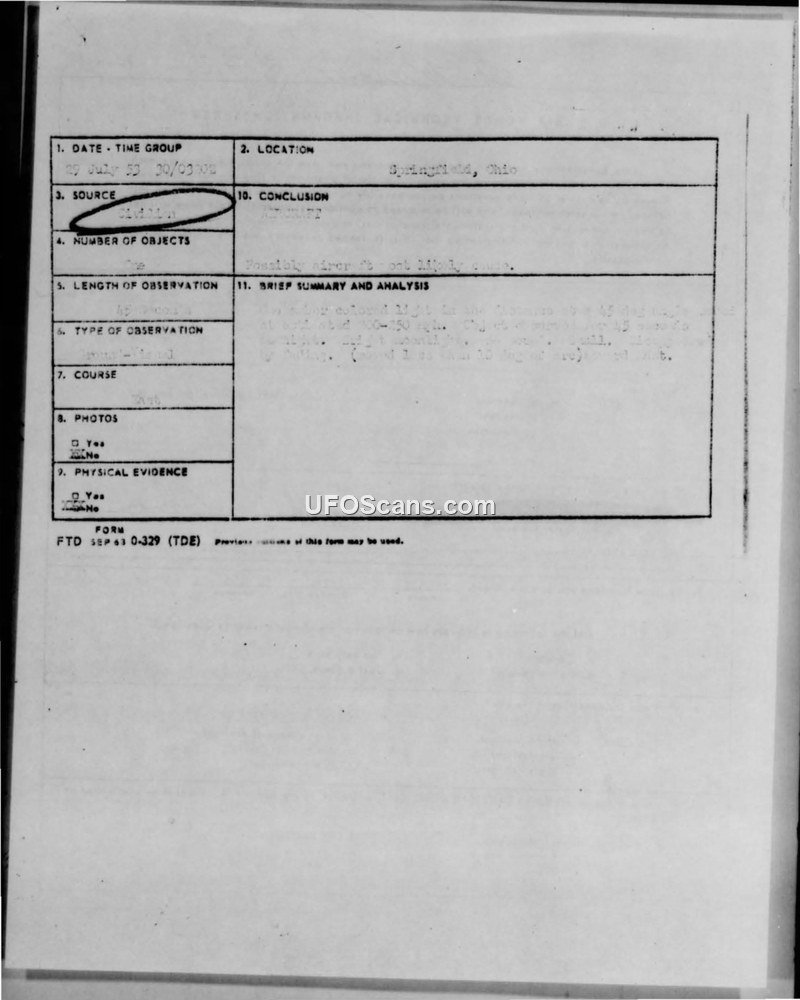 U.S. Air Force Technical Information Sheet — Sighting Report, Springfield, Ohio, 29 July 1953