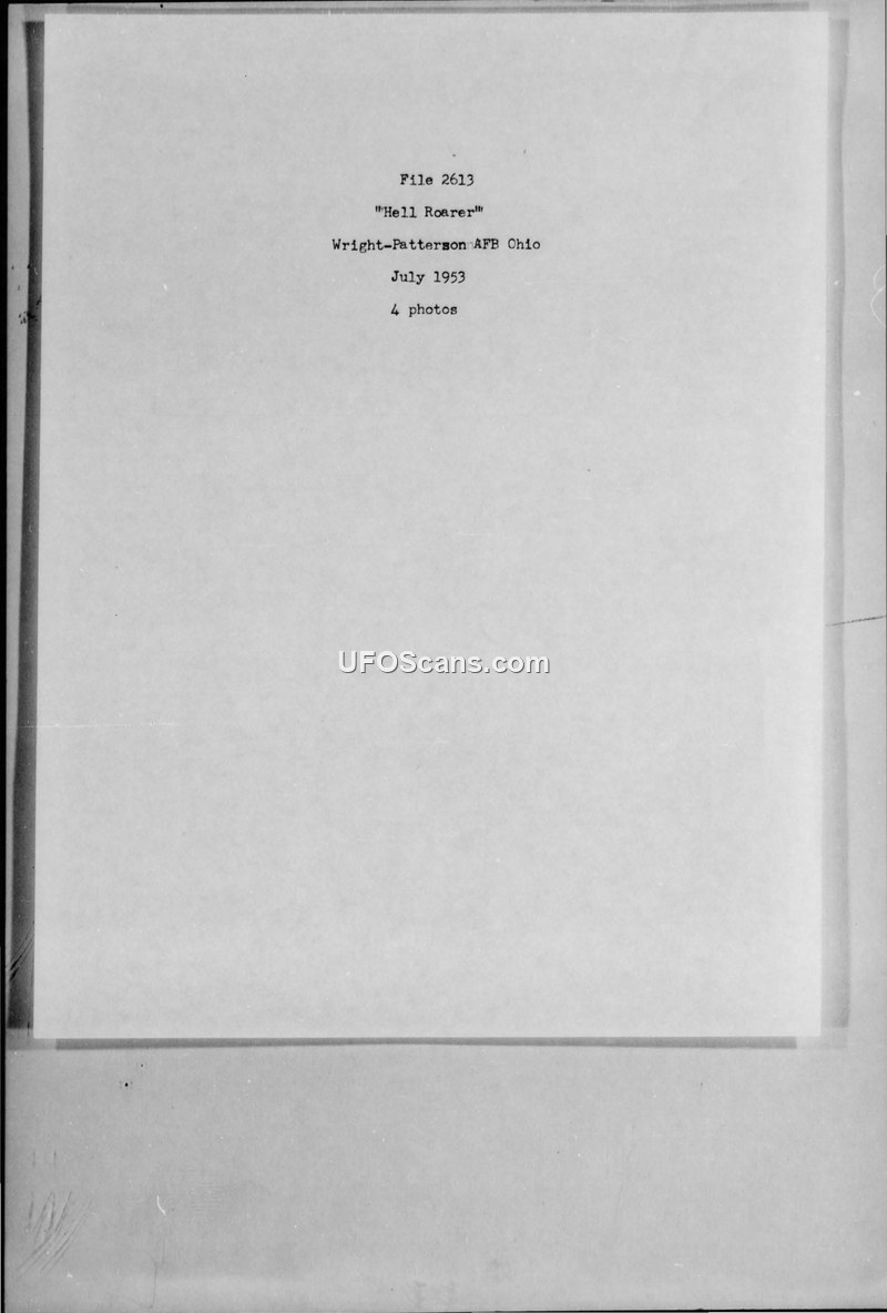 This document, identified as File 2613 and dated July 1953, provides photographic documentation of a project designated as 'Hell Roarer' conducted at Wright-Patterson AFB, Ohio. The file contains four photographs detailing the installation and operation of a magnesium burner system on an RB-26 aircraft. According to the technical notes provided with the photographs, the system functions by utilizing 300 pounds of powdered magnesium stored in a wing tank. This magnesium is introduced into a tube where it mixes with air entering through a forward-facing scoop. The mixture is then ignited by two spark plugs located at the extreme end of the tube, creating a significant visual effect. The photographs illustrate the installation on the aircraft, a daylight view of the system in action, a ground-level view of the combustion, and a time-exposure photograph taken at night showing the path of the aircraft. The document serves as a technical record of this specific experimental installation, documenting the physical configuration and the resulting visual output of the magnesium burner system.