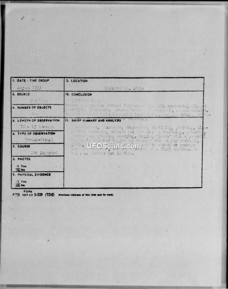 This document, identified as FTD SEP 63 0-329 (TDE), serves as a compilation of reports regarding unidentified aerial phenomena occurring in August 1953. The first section pertains to a report from Centerville, Idaho, involving a single object observed for 10 to 15 seconds. The summary of this incident is highly dramatic, describing a 'tremendous, fantastic, stupendous, chilling, piercing, high-pitched screaming whistle' and a 'deafening, powerful, gargantuan, grunting, charging, tugging beast' that appeared to threaten the observer. The second section details a sighting in Sharonville, Ohio, involving multiple witnesses at a G.E. plant. These witnesses observed a 'brilliant milk-white disc' that appeared in a bright, sunny sky. The object was described as being as large as the moon and resembling 'burning magnesium.' According to the witnesses, the object moved from the east, stopped abruptly overhead, and began to pulsate, appearing to 'worm' or 'squirm.' The observation lasted at least 30 seconds, during which the object maintained its brilliance. One witness noted that the disc left a 'short, squat, teardrop shaped trail of luminescence' in its wake. Another witness described the object as 'rotating' and suggested that its elongated appearance might have been a visual effect of its exhaust. The object eventually accelerated, appearing to move at three times the speed of a jet, and disappeared into the horizon. The document notes that the Air Force had cleared the rest of the August 1953 story, though the specific details of that clearance are not provided. The report format includes standard fields for date, location, number of objects, and physical evidence, though many fields remain incomplete or marked as 'not reported.'