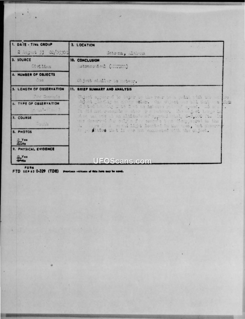 This report documents five UFO sightings in Alabama during August 1953, which were officially attributed to meteor activity. It also includes later correspondence regarding unrelated claims of metallic fragments found in Connecticut.