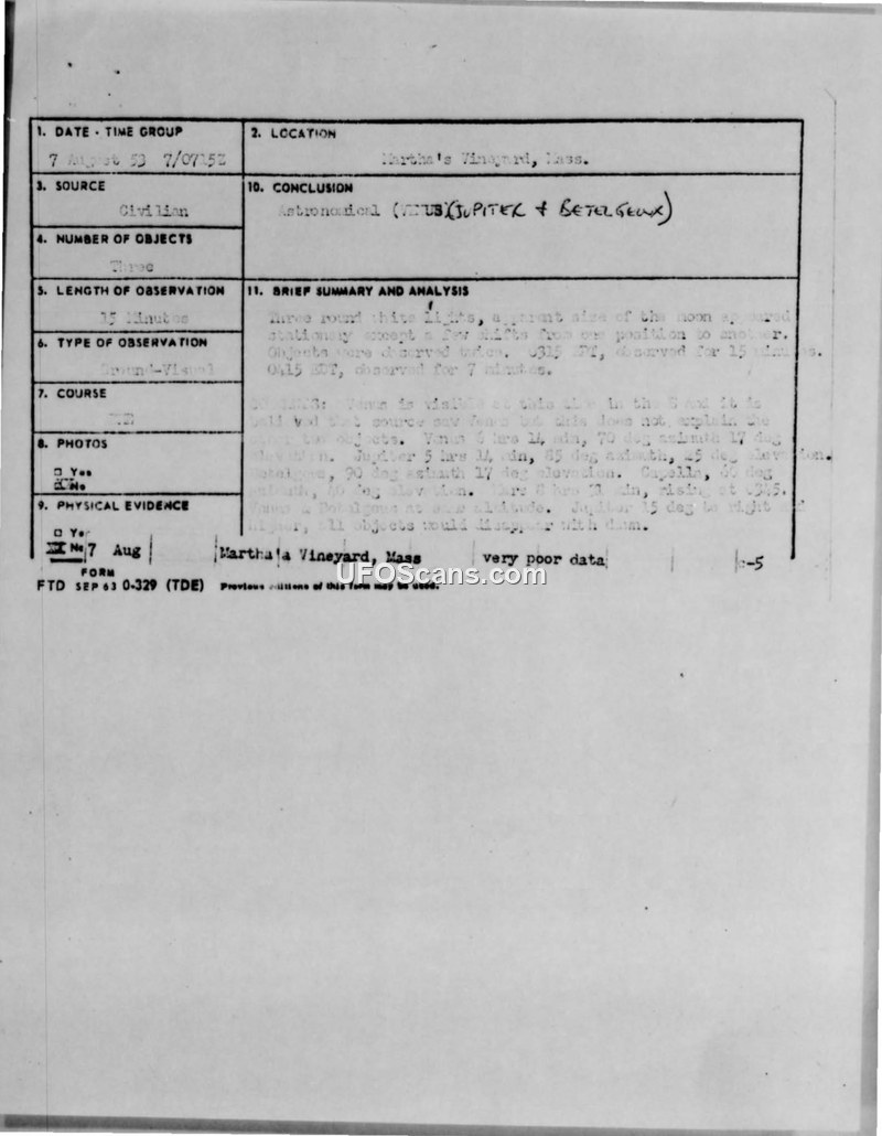 This document consists of a series of military communications regarding a UFO sighting reported on 7 August 1953 in Martha's Vineyard, Massachusetts. A housewife and her twelve-year-old son reported observing three stationary, round, white lights, each approximately the size of the moon, for a duration of fifteen minutes. The witnesses described the objects as having no perceptible speed or sound, though they later appeared to change shape into 'half moons' with a dull glow. The 4707th Defense Wing at Otis AFB initially reported the incident, which was subsequently investigated by the Air Technical Intelligence Center (ATIC) under Project Blue Book. Despite the witnesses' insistence that the objects were not stars or meteors, the official conclusion reached by the military was that the sighting was astronomical in nature, identifying the objects as Venus, Jupiter, and the star Betelgeux. This conclusion was supported by a telephone consultation with the Harvard Observatory, which noted that the timing of the sighting coincided with a period of high meteorological shower activity. The documentation includes the original message forms, internal routing, and the final assessment, which characterized the provided data as 'very poor.'