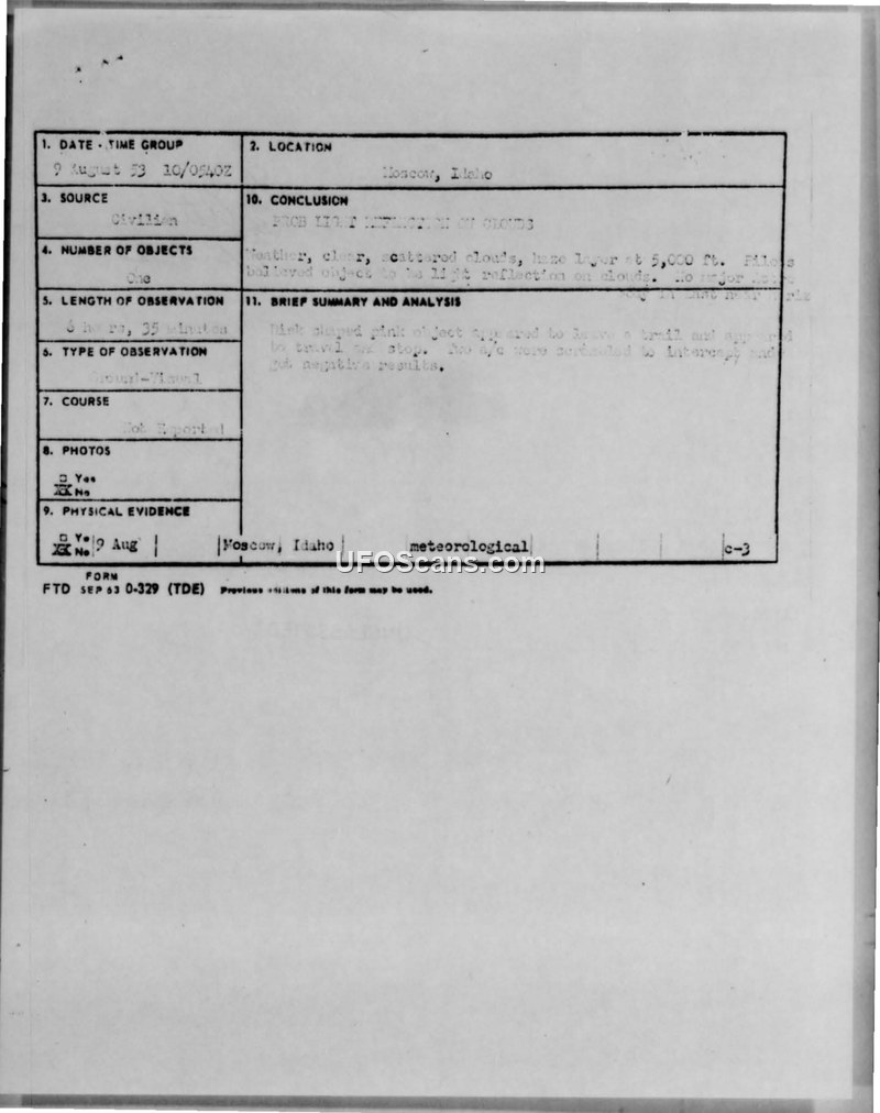 A military cable reporting a 6-hour sighting of a pink, disk-shaped object in Moscow, Idaho, in August 1953. The military concluded the object was a light reflection from the town of Potlatch, Idaho.