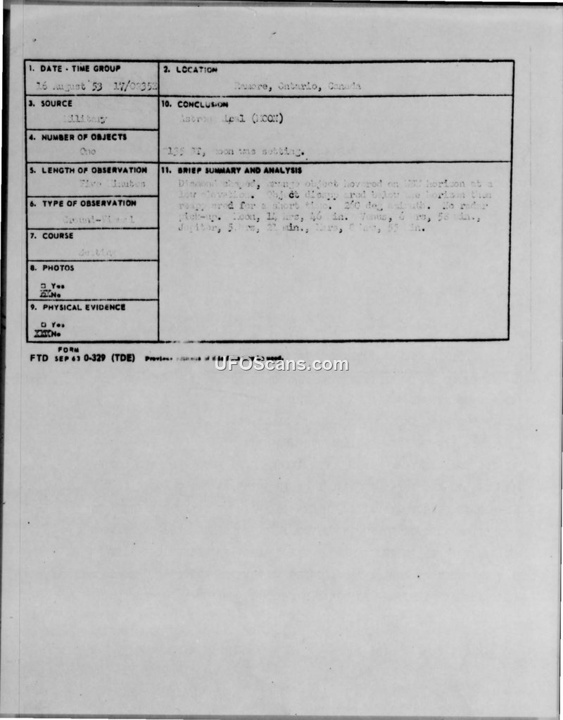 Multiple airmen at the 912th AC&W Squadron in Ramore, Ontario, reported a bright, stationary, orange-red object on August 16, 1953. Despite the visual reports, radar showed no contact, and the incident was officially classified as an astronomical phenomenon.