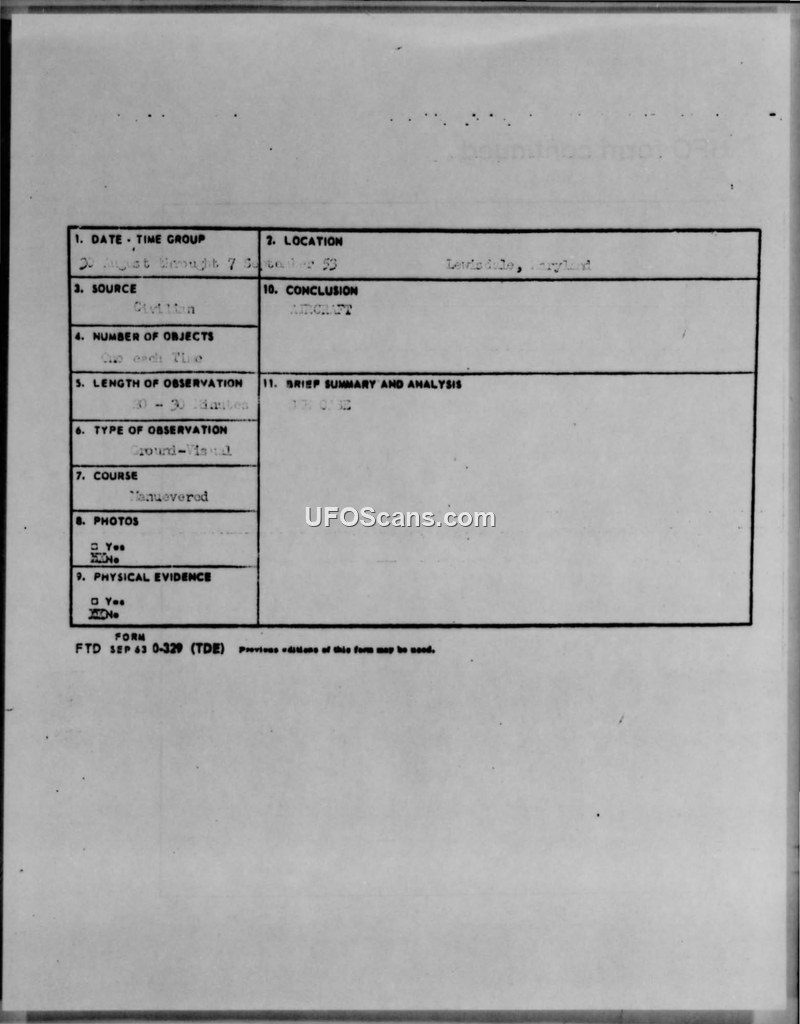 Most sightings were attributed to balloons, aircraft, or astronomical phenomena. One specific report from Lewisdale, Maryland, was determined to be commercial aircraft landing lights.