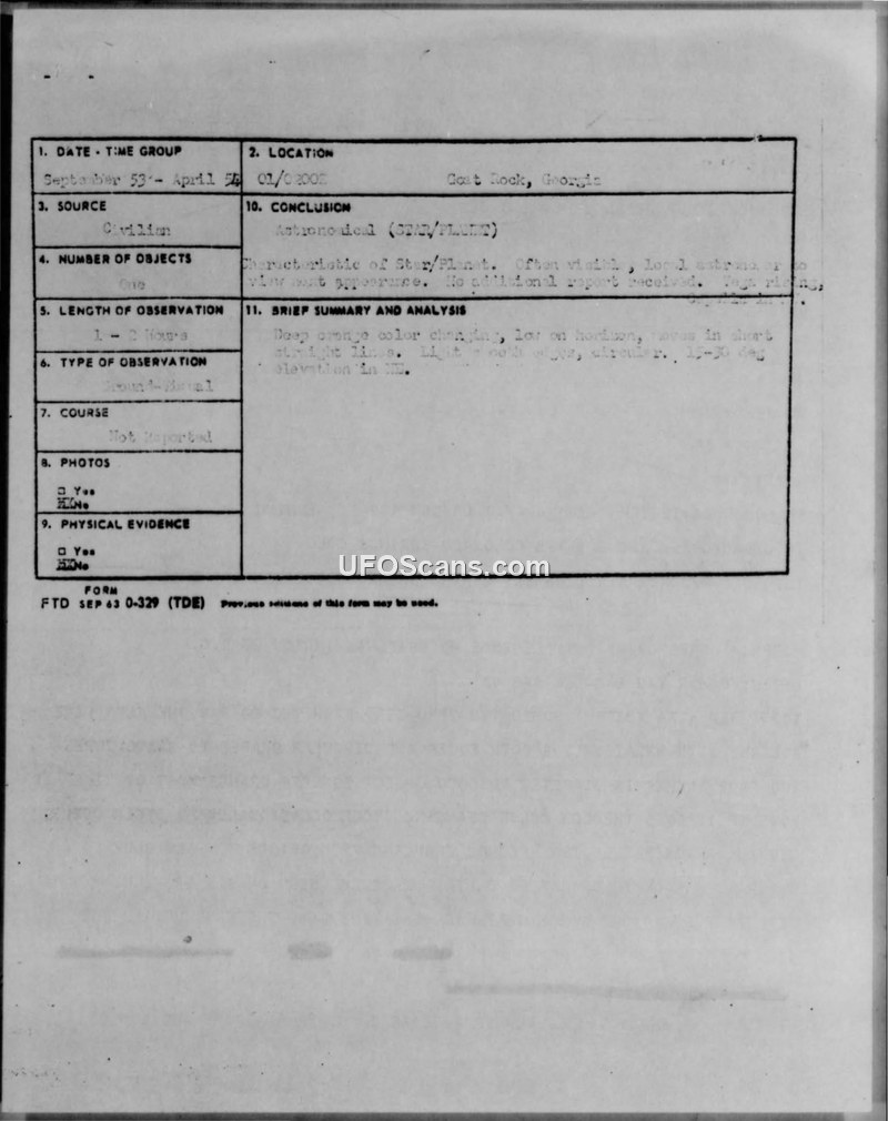 A series of reports detailing a recurring unidentified aerial object in Goat Rock, Georgia, between 1953 and 1954. The object was eventually classified as having the characteristics of a star or planet.