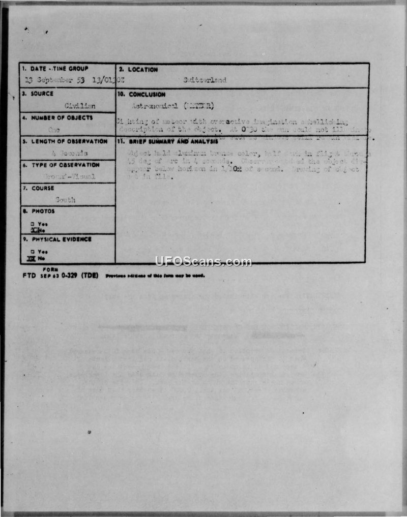 A 1953 sighting report from Switzerland describes a large, rectangular, soundless object. The official Air Force conclusion dismisses the report as a meteor sighting.