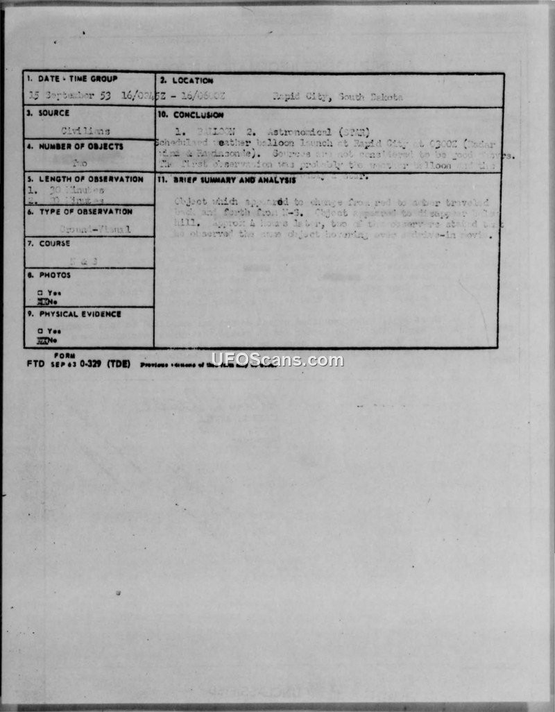 Air Intelligence Information Report — Black Hawk, South Dakota, 15 September 1953