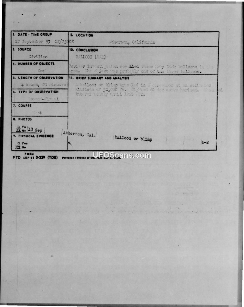 A sighting of an object in Atherton, California, on September 18, 1953, was investigated by the Air Force. It was officially identified as a Project Moby Dick weather balloon.