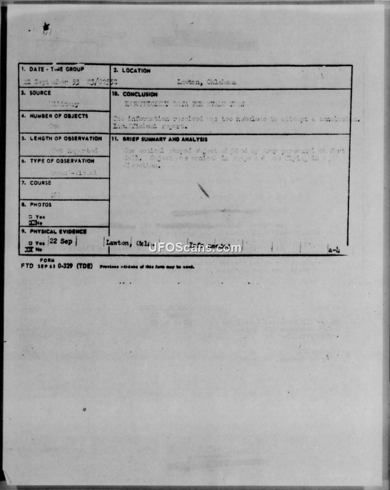Military personnel at Fort Sill, Oklahoma, reported a conical-shaped object with a white light and long exhaust trail on September 22, 1953. The official military assessment concluded there was insufficient data to evaluate the sighting.