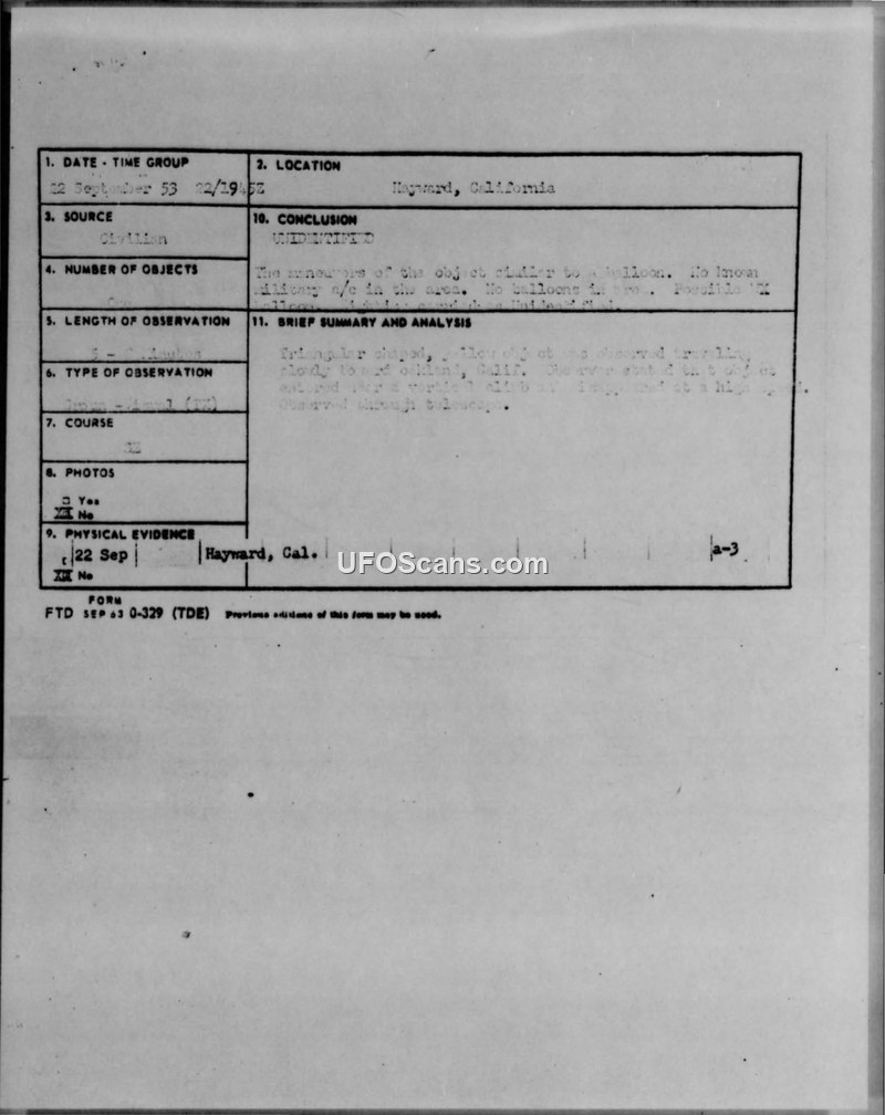 Unidentified Flying Object Sighting Report — Hayward, California, 22 September 1953