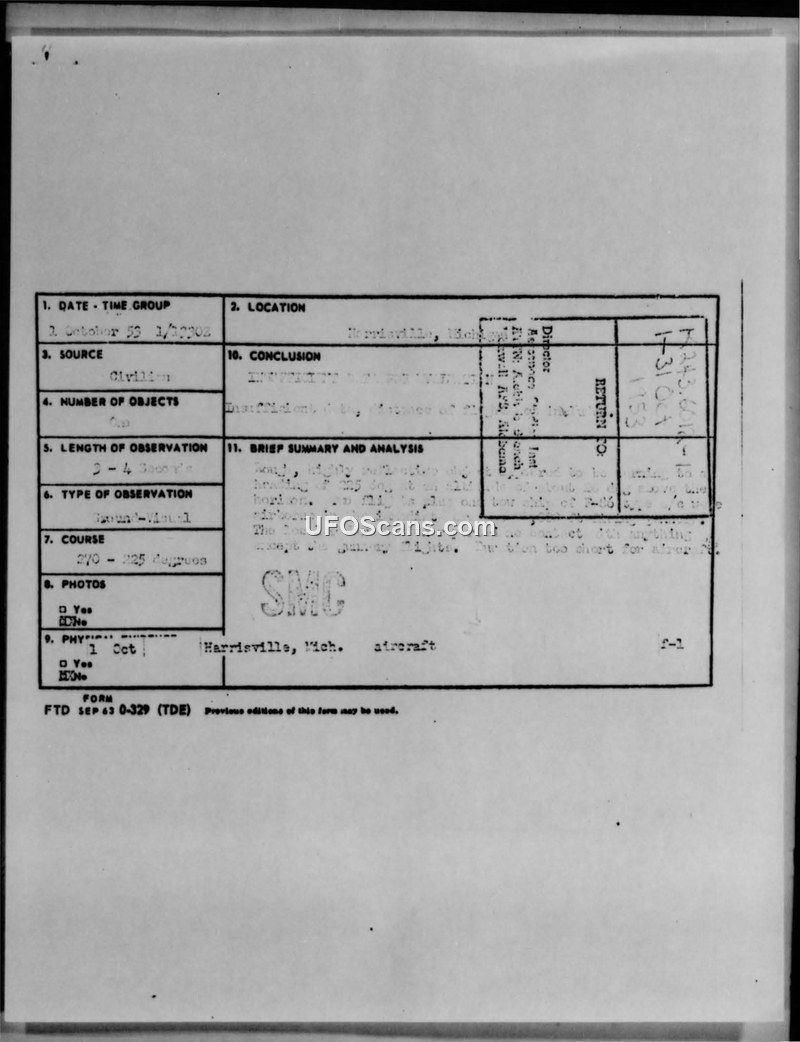 Air Intelligence Information Report — Sighting near Harrisville, Michigan, 1 October 1953