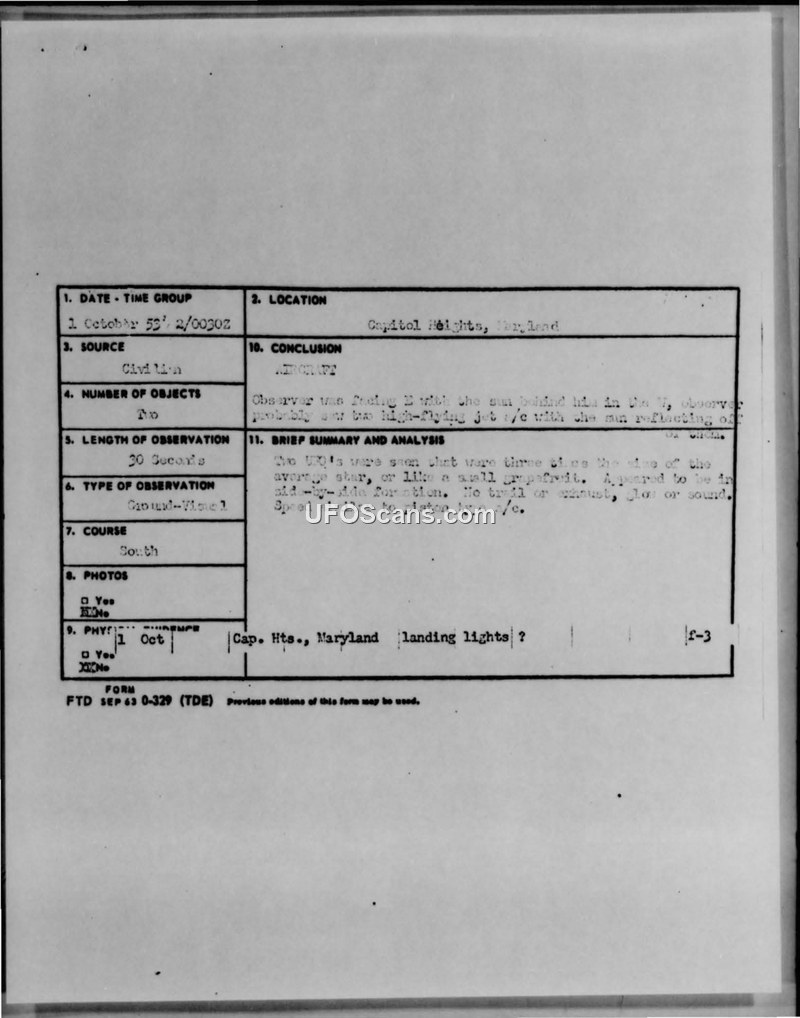 A report of two unidentified objects sighted over Capitol Heights, Maryland, on October 1, 1953. The objects were described as round, white, and moving in a straight, level formation before separating.